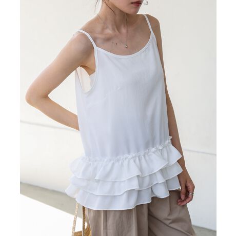 裾のフリルが特徴のキャミソール。使いやすい2色展開でコーディネートに合わせやすいアイテムです。ボリュームのあるフリルが一気に女性らしさを演出してくれます。重ね着で使うと腰回りのカバーにもなるのが嬉しい!