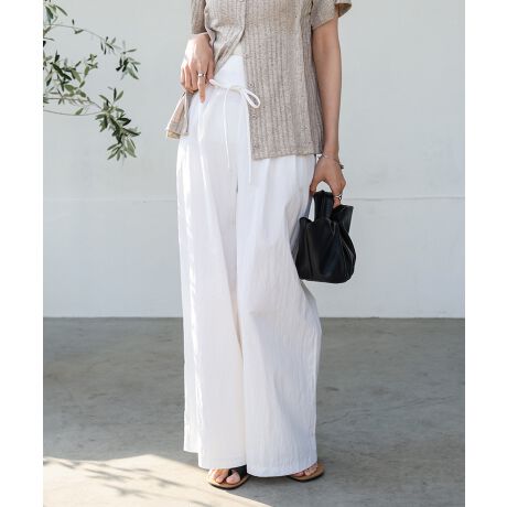 ウエストのデザインで他と差をつけるパンツの登場!ウエストのタックが、フラットになりがちなパンツに立体感と動きを生みより洗練された印象を与えてくれます。タックが腰回りに余裕を持たせるため、締め付け感なくリラックス感のある着心地です。ウエストリボンもアクセントになります。