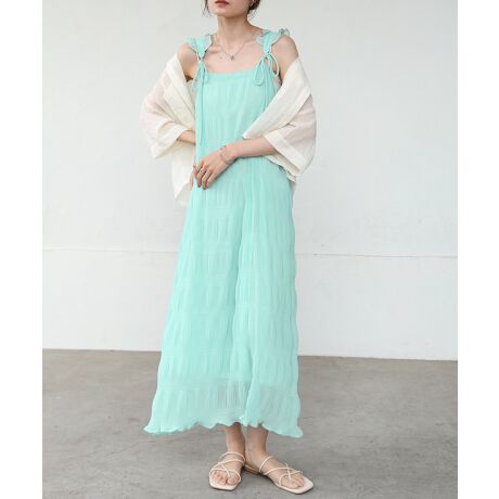 肩ひものリボンがポイントのプリーツワンピが登場。ワンサイズですがリボン部分で長さ調節が可能になっています!ポリエステル素材の柔らかい質感なのでさわやかな雰囲気になります。肩部分のフリルがフェミニンさをプラスします。ワンピース全体がIラインのプリーツになっているのでそこまで広がらないためスタイルアップして見えます。中にTシャツやシアーインナーを合わせてフェミニンスタイルにカジュアルをプラスしても、夏っぽい雰囲気が出ます。薄手の羽織を合わせて柔らかい雰囲気のスタイリングにするのもオススメです!
