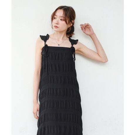 肩ひものリボンがポイントのプリーツワンピが登場。ワンサイズですがリボン部分で長さ調節が可能になっています!ポリエステル素材の柔らかい質感なのでさわやかな雰囲気になります。肩部分のフリルがフェミニンさをプラスします。ワンピース全体がIラインのプリーツになっているのでそこまで広がらないためスタイルアップして見えます。中にTシャツやシアーインナーを合わせてフェミニンスタイルにカジュアルをプラスしても、夏っぽい雰囲気が出ます。薄手の羽織を合わせて柔らかい雰囲気のスタイリングにするのもオススメです!