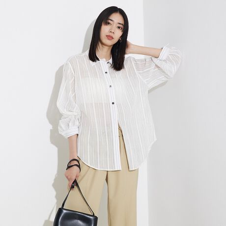 透け感とストライプのバランスが絶妙で、1枚でこなれ感のあるスタイリングが完成します。