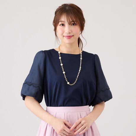 透け感のあるオーガンジーとチュールを重ねた袖にスカラップ切替がアクセントになったボリューム袖カットソー。