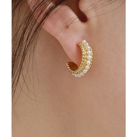 上品な輝きを放つパールと、繊細なツイストゴールドが組み合わさったフープピアス。