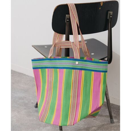 薄着になってシンプルになりがちなコーディネートのアクセントにぴったりなマルチストライプのメッシュバッグ。