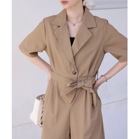 春夏に着たい1枚でサマになるオールインワンの登場!胸元がすっきりとして見えるテーラードシルエットと、ワイドストレートパンツでハンサム見えしつつ、ウエストのリボンで女性らしさもプラス。ウエスト位置が高く足長効果があるのも嬉しいポイントです。