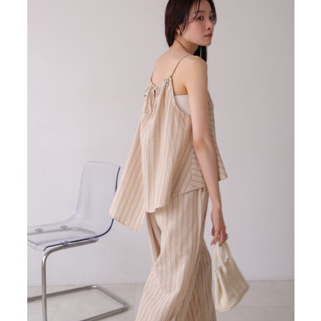 上下セットで着るだけでサマになります。別々でも着られてデザイン性のあるキャミトップスはデニムなどに合わせて夏らしい涼しげな印象をプラスしてくれます。