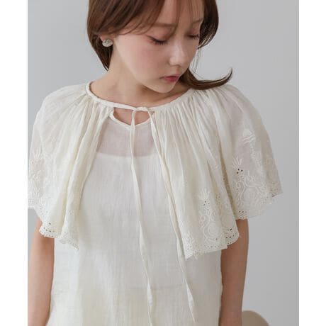 ふんわりとした質感が特徴のコットンボイル生地のブラウスが登場!肩から胸元にかけてフリルケープ風デザインになっており、顔周りに華やかさと立体感をプラス。ボリューム感があるため華奢みえ効果も◎レースの透け感がナチュラルでありながら大人の上品さを演出。フリル部分にはパンチングレースが施されており、繊細でフェミニンな印象を出してくれます。