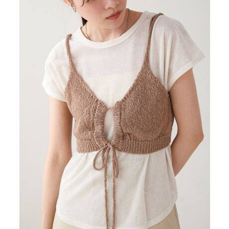 ウエスト部分に長めのドロストがついたデザイン性バツグンのビスチェが登場!ウエストに視線を集めるデザインなのでスタイルアップ効果もあり、メリハリのあるシルエットを作ることができます。ざっくりとした編み地の表面感で夏らしい涼しげなアイテムに仕上がりました。