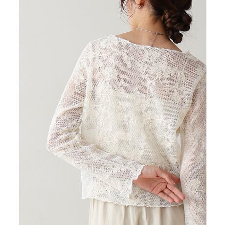 立体感のある刺繍と、ほどよい肌見せが叶う透かし編みを組み合わせた、上品かつ華やかな1枚。シアー感のある編み柄が涼しげで、季節感たっぷりに着こなせます。ほどよく身体から離れるリラクシーなシルエットで、体型を拾いにくく、快適な着心地。インナー次第で印象を変えられるのも嬉しいポイント。