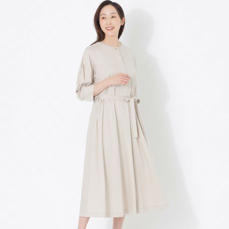 ジャージー素材でありながら、まるで布帛のようなハリ感に、毛羽が少なく艶やかな光沢を持ち、肌触りは絹のようになめらか。一般的なジャージー素材とは一線を画す、ドレスライクで上品な風合いを特徴としています。接触冷感性も加わりました。