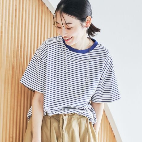 気持ちのよい肌触りの厚手の生地で、たっぷりしたデザインで身体の線を拾わない。二の腕も気にならないのがうれしい。ロイヤルブルーのボーダーも幅広い世代に対応できそう。洗濯しても形崩れしにくそうでよい。