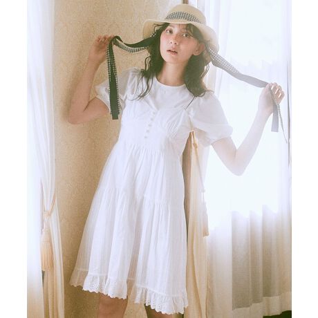 コットン素材で仕立てたナチュラルな素材感が魅力的なワンピース。ウエスト下からレース生地で切り替え、ふんわりと広がるシルエットがフェミニンムードを引き立てます。バックゴム仕様で快適な着心地なのも嬉しいポイント。一枚着はもちろんパンツとレイヤードしたスタイリングもおすすめです。
