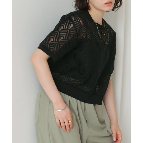 シアー感が今年らしいオーガンジーの素材に刺繍を施して柄に仕上げたTOPS。キレイめな素材感に衿・袖口や裾のリブ使いのMIX感がコナレタ印象のアイテムです。トレンド感のあるやや短めのブラウスで、ワイドシルエットのボトムとの相性◎