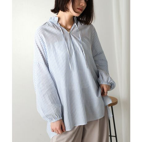 衿元には細かなスタンドのフリルで上品なフェミニンさを感じさせつつ、たっぷり入った身頃と袖のギャザーディティールの映えるブラウス。