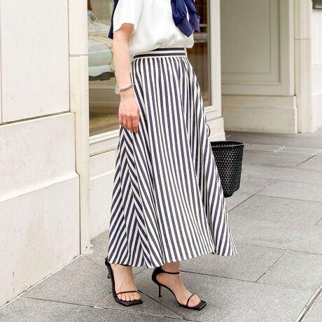 ・夏らしい爽やかさのあるストライプ柄のフレアスカート