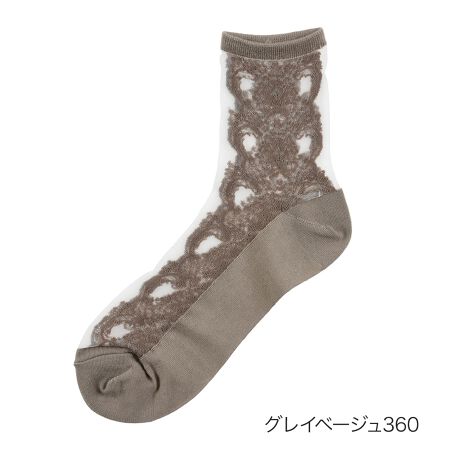 エレガンス・モダンガーリー・大人フェミニンが好きなあなたにおすすめしたい『femieu(フェミュウ)』シリーズです。デザイン性の高い繊細なレース柄と、シアーの切替えクルー丈ソックスです。つま先とかかとに補強も施され、デザイン性、機能性にも優れたソックスです。