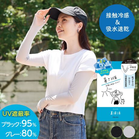 夏の暑さ対策におすすめの『美涼活シリーズ』の接触冷感、吸水速乾機能付きのロングアームカバーの登場です。三本の指が通せるようになっていて甲まで覆える形になっています。UV加工がされていて肌触りがよく、ひんやりする夏にぴったりのアイテムです。