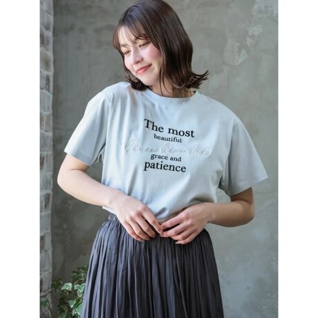 フロッキープリントとラメ刺繍のロゴがアクセントになるTシャツ