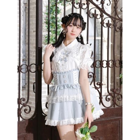 襟や袖口にはレースを施しており、スタイリングに華やかな印象をプラスします。