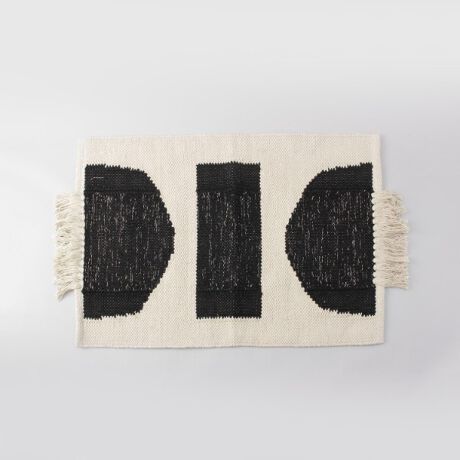 モノトーンの幾何学模様と両サイドについたフリンジがポイントの玄関ラグ。