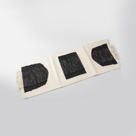 モノトーンの幾何学模様と両サイドについたフリンジがポイントのキッチンマット。
