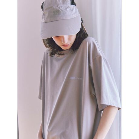 生地から別注したつばが広めのナイロンロングビルキャップは撥水素材でUVカット機能付き。バンジーコードを採用し、Tシャツと同じ柔らかなライトグレーのカラーで染色。