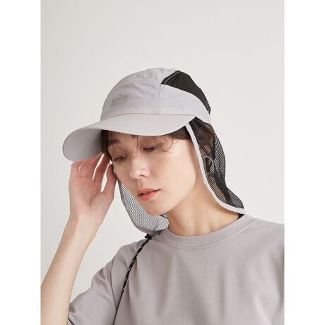 生地から別注したつばが広めのナイロンロングビルキャップは撥水素材でUVカット機能付き。バンジーコードを採用し、Tシャツと同じ柔らかなライトグレーのカラーで染色。