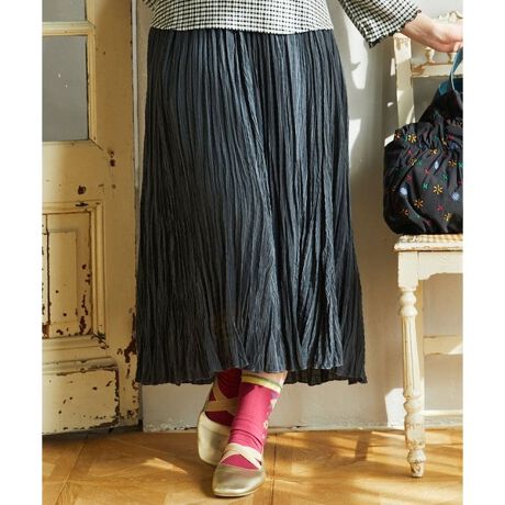 ランダムプリーツを施したベーシックなスカート。プリーツがフワッと動くシルエットで、動くたびに華やかな印象を与えます。凹凸のある格子状の軽やかな生地にランダムプリーツを施し、ウエストはオールゴム仕様にお仕立てしました。履き心地が良くシワが気になりにくいのも魅力的です。あると嬉しいポケット付き。