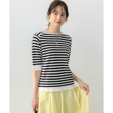 ■デザインまるでTシャツの様な着心地と機能、長い夏に重宝する5分袖コンパクトニットTEEです。前に振った肩の切り替えと、襟と袖に配色ラインがポイント。ジャケットインにもおすすめです。ニットなのできれいめでカジュアル過ぎずオフィスから普段使いまで幅広いシーンとロングシーズンご使用いただけます。