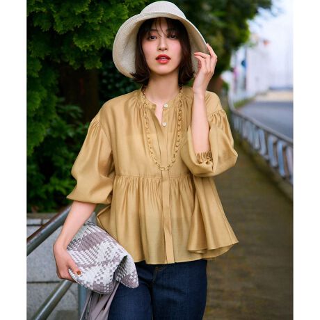 裾に向かってボリュームを出した一枚で着映えるデザインブラウスです。羽織としても着用しやすいデザインに仕上げました。同素材を使ったカットソー(品番: KKWOGM0436)と合わせると新しい着こなしを楽しんでいただけます。シンプルでボトムを選ばず、カジュアルにも綺麗めにも合わせやすいので、春夏のワードローブに加えておくと頼りになること間違いなしです。カラバリも豊富で、カラーはシックなブラック(#005)と柔らかい印象のベージュ(#033)、こなれ感のあるダークブラウン(#030)、キャッチ―なイエロー(#040)4色展開です。