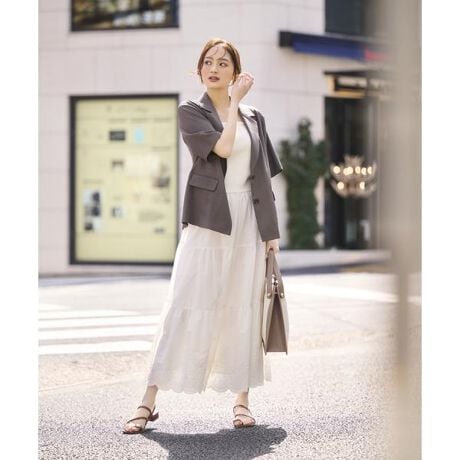 裾まわりに刺しゅうをあしらったティアードスカートです。刺しゅうはスカートの素材と同色なので着回し力はバツグン。ポリエステル混率が高いため、シワになりにくく、後ろウエストはゴム仕様ではき心地も良いです。