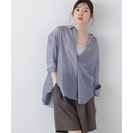 PROPORTIONで大好評のブラウスがシアー素材になって登場!バックスタイルのシャーリング、前後差をつけた裾、サイドはラウンドカットが入っているデザインはそのまま、シアー素材で季節をアップデートできます。裾をアウトしてパンツ・ナロースカート合わせがお勧めです。