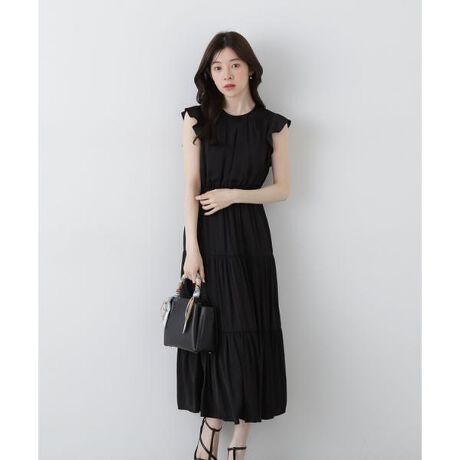 ほどよい光沢感が大人フェミニンな雰囲気のティアードワンピース。前はすっきりと仕上げながら、後ろにあしらったレースアップがポイント。袖は短めのフレンチスリーブにラッフルフリルディテールを加えて、着やすいデザインに。後ろウエストのレースアップでサイズ調節ができます。