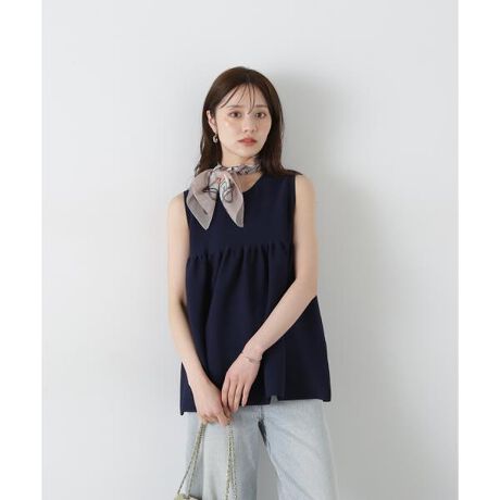 16Gの糸を使用したキレイなニットは、胸上から入れた切り替えと後ろのさり気ないリボンが愛らしいポイント。肩まわりは大きく見えないようデザインしています。ショートパンツやデニムパンツ合わせがお勧めです。
