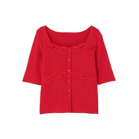レース切り替えが大人フェミニンな雰囲気のリブニット。デコルテラインが大きく開いているので、顔まわりをキレイに見せてくれます。飾りボタンのディテールも映え、女性らしいアクセントになります。