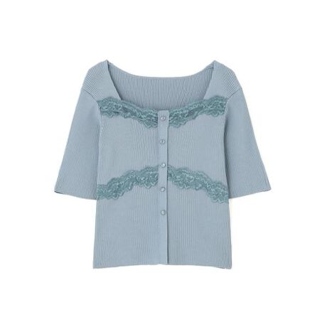 レース切り替えが大人フェミニンな雰囲気のリブニット。デコルテラインが大きく開いているので、顔まわりをキレイに見せてくれます。飾りボタンのディテールも映え、女性らしいアクセントになります。
