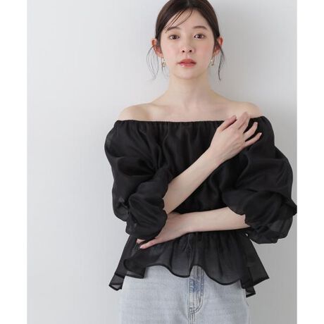 袖を2重にしたバルーンスリーブがオトナ可愛いブラウス。襟ぐりはゴムが入っているのでオフショルダーとしても着用でき、デコルテラインをキレイに見せながら調節できます。裾は前から後ろにかけて長さを出したフィッシュテールもポイントです。