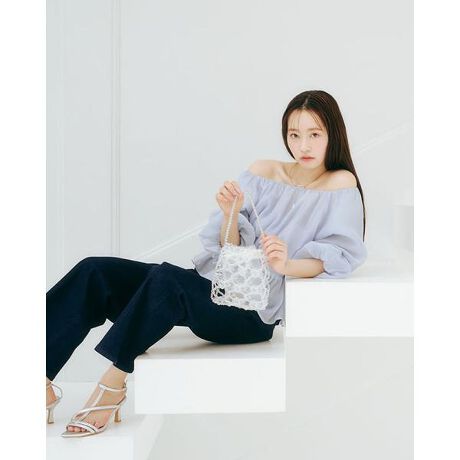 袖を2重にしたバルーンスリーブがオトナ可愛いブラウス。襟ぐりはゴムが入っているのでオフショルダーとしても着用でき、デコルテラインをキレイに見せながら調節できます。裾は前から後ろにかけて長さを出したフィッシュテールもポイントです。