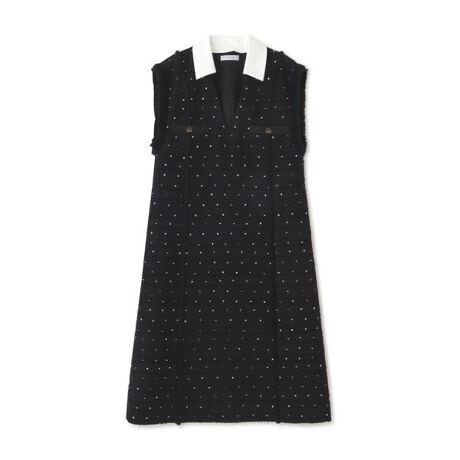 国内の尾州で織り上げられたツイードドレス。フラワー柄のスパンコールが織り込まれ華やかなファンシーツィード素材に。身頃の切り替え部分に別素材が挟み込まれています。