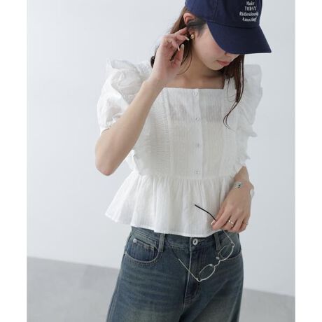 毎年定番の肩フリルウエストウエストシャーリングブラウスを大幅にデザインリニューアルしました。カラミドビーレース生地でガーリーな印象に。チェック生地は使いやすいギンガムで楊柳素材を使用。肩の切り替え部分にシャーリングを施し、デコラティブな印象です。前はウエストまでボタン開きにし、レトロムードなデザインに。シャーリングやボタン開きディテールなど、1枚で様になるブラウスなので、シンプルにデニムと合わせたフェミカジコーデがおすすめです。※モデルの着用画像の場合、光の当たり具合により、実際の色味と異なって見えることがございます。色味は、商品単体の画像をご参照ください。