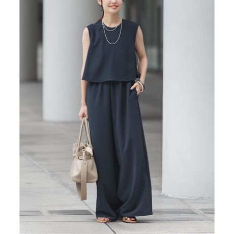 滑らかな手触りが特徴のダブルクレープ素材を使用した、着心地抜群のオールインワン。