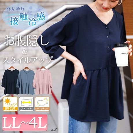 お腹隠し&スタイルアップ、ペプラムブラウス。暑い季節のお出かけも快適に過ごせる、ひんやり涼しい接触冷感&紫外線から守ってくれるUVカットのうれしい機能性!ハイウエスト切り替えで目線を上げてスタイルアップ効果◎ふわり軽やかペプラムでお腹&ヒップ周りをまるっとカバー!ストレッチ&シワになりにくく、気軽に着用できるのもうれしいポイント!