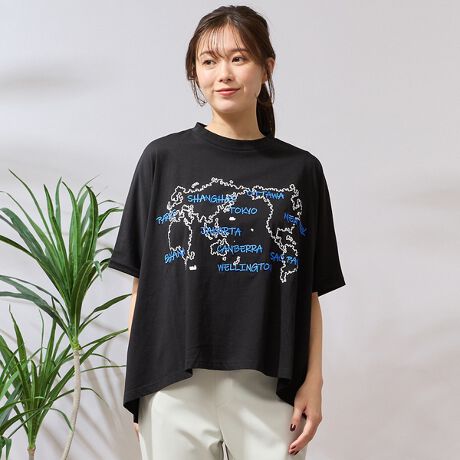【手洗いOK・綿100%】世界地図プリント&刺繍カットソー