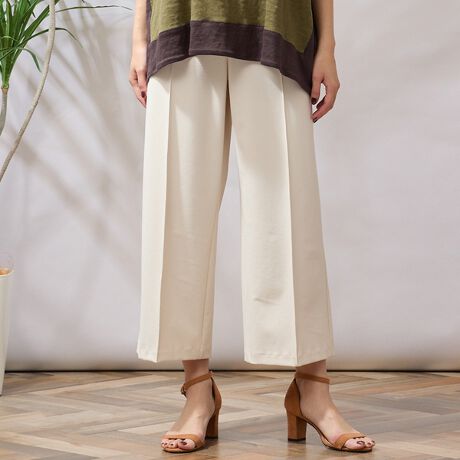 夏にすっきり見えするアンクル丈のワイドシルエットで、前側はピンタック、後ろ側はセンタープレスでタテのラインで足をスッキリ長く見せてくれます。