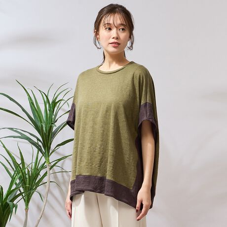 【手洗いOK・麻100%】バイカラー配色ポンチョトップ