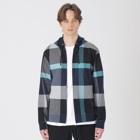 【全面にチェックをあしらった清涼感あるジップアップパーカー】