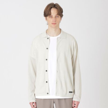 ハイゲージで編まれた和紙ミックス糸のニットは、ほんのり透け感があり軽くて涼しげな一着です。清涼感あるさらりとした肌ざわりで、暑い季節にもTシャツの上にシャツ感覚で着用できます。フロントを留めてジャケットのインナー使い等、様々な着こなしが楽しめます。