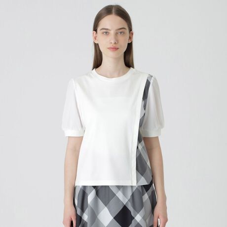 綺麗めなスムース素材と光沢感が上品なチェック素材の異素材コンビカットソーです。