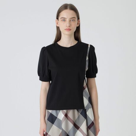 綺麗めなスムース素材と光沢感が上品なチェック素材の異素材コンビカットソーです。