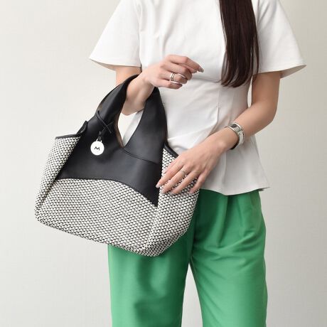 レザーハンドルの雑材バッグは、たっぷりと荷物を収納できるサイズ感で、デザイン性と機能性を併せ持ったアイテムです。
